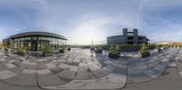 three panoramas of a modern building with a green roof with an ornamental planter in it