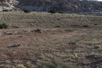 a car in a dry area, near a rocky hill, near some dirt and shrubs