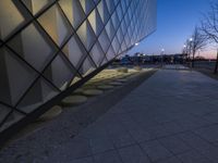 A stunning view of modern architecture in Berlin, Germany. The towering Futurium building casts a shadow over the surrounding area at dawn. The sleek design and reflective surfaces create a captivating display of light and color.
