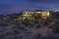 A dramatic and emotive image captured during dawn in Yucca Valley, California. The silhouette of a desert home stands against the backdrop of blue skies and mountains. The open space and natural surroundings create a sense of tranquility.
