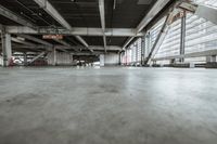 some cars are parked in the large warehouse area of a building, with no people walking on