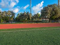 This image shows a man running on an outdoor track in Miami Beach, Florida, USA. The clear blue skies and greenery of the surroundings create a picturesque scene. In the background, there is a flag pole and trees, highlighting the natural beauty of the location. The stadium and field in the distance indicate a sports event or practice, possibly soccer or football. This photo captures the essence of a sunny day in Miami Beach.