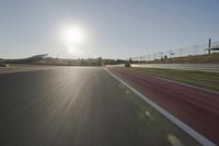 This image captures a wide asphalt road extending into the horizon under a clear sky. The sun is visible, casting a warm sunlight over the field beside the road. The motion blur effect suggests the speed and movement of the automobiles on the highway. This scene evokes a sense of freedom and open space, resembling a race track. The atmosphere is filled with anticipation and excitement, as if there is a race taking place at the distant stadium. With the sun shining brightly, it is a perfect day for racing.