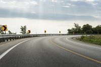 This image captures a straight road in the countryside. The asphalt road is lined with yellow lines and stretches into the distance, disappearing into a low cloud cover. The landscape is flat and open, with no buildings or structures in sight. The road surface is smooth, suggesting a well-maintained highway. A curve in the road can be seen ahead, with a shoulder and a thoroughfare on the side. An Armco barrier lines the road for safety. This photo showcases the infrastructure and road network in a rural area.