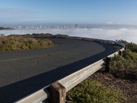 This is an image of a road in California, USA. The asphalt road is shown curving through the landscape under a clear sky. In the distance, you can see the iconic city of San Francisco. Along the road, there is an Armco barrier for safety. The view is from above the clouds, giving a unique perspective. This photo captures the beauty of the California landscape and the famous city of San Francisco.