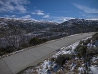 A top-down view of a snow-covered mountain landscape. A concrete country road winds its way through the highland, surrounded by trees and shrubs. Blue skies provide a stunning backdrop to this elevated winter scene.
