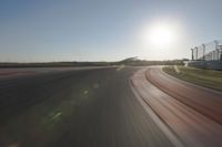 This is an image of a straight road with asphalt surface stretching into the horizon. The clear sky above shows a beautiful sunrise, casting a warm glow on the surrounding field. The motion blur effect captures the speed and excitement of a race or race track. The image showcases the infrastructure of the road and the stadium in the distance, where the racing takes place. It is a perfect representation of a sunny day, with the sun visible in the sky. This photo invites the viewer to experience the thrill of fast cars and open roads.