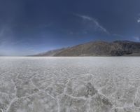 a panoramic image shows a view of the water in a desert area, with mountains in the background