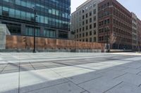 A clear sky day in Denver, Colorado. The modern architecture of a low-rise mixed-use building creates a stunning reflection in the courtyard. The open space plaza is a vibrant public space in the heart of the metropolitan area.