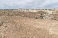 A young boy jumps for a frisbee in the rugged desert landscape of Utah, USA. The red rock formations and elevated terrain create a stunning backdrop. The gloomy, grey sky adds a touch of mystery to the scene.