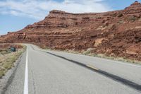 This image captures a straight road cutting through the desert landscape of a national park. The road surface is made of asphalt and stretches out endlessly, disappearing into the distance. Surrounding the road are stunning red rock formations and tall mountains. The clear blue sky is dotted with fluffy clouds and contrails left by passing planes. The scene showcases the unique geology of the area, with rock walls, canyons, and an escarpment in the background. This photo encapsulates the beauty and ruggedness of the wilderness, highlighting the infrastructure of the road within the magnificent natural surroundings.