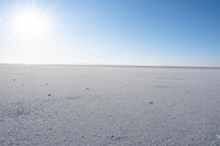 A sunny day in California's desert landscape. A person confidently rides a horse across a snow-covered field, with the sun shining on the horizon. The open space and clear sky create a picturesque scene.