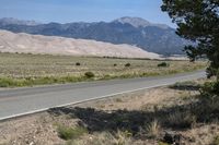 Vast desert landscape in Colorado, with a majestic mountain range as the backdrop. Empty asphalt road cutting through the wilderness. Clear sky perfect for a day of exploring nature.
