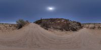 a large rock with dirt trail near it in desert area under full moon sky in daytime