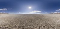 A vast desert landscape stretches as far as the eye can see, with a lone figure on the horizon. The rugged terrain features sandy plains, gravel roads, and mountain ranges in the distance. A serene and isolated natural environment.