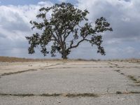 This stock photo features an empty asphalt area in the low desert of California, USA. In the middle of the barren landscape, there is a lone tree standing tall. The image captures the rugged beauty of the California desert, with its dusty dirt road and gravel surface. The tree, with its woody branches and green leaves, adds a touch of life to the otherwise desolate scene. The clear blue sky with scattered clouds completes the picturesque view. This photo is perfect for illustrating nature, off-road tracks, and the unique beauty of California's desert landscape.
