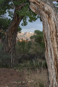 trees and grass in a desert landscape with mountains in the background, as seen through two branches