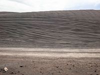 A picturesque desert landscape with large mounds of rocks and gravel. A black horse stands majestically in the foreground. The clear blue sky and scattered clouds add to the beauty.