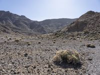 This stock photo features a beautiful desert landscape in Spain. In the foreground, there is a small planter and sparse grass, surrounded by a rocky hillside. The open space and rugged terrain give a sense of wilderness and adventure. The sun is shining brightly, illuminating the scene and creating a sunny and warm atmosphere. The image showcases the natural beauty of Tenerife, a captivating island in Europe that boasts stunning mountain landforms. The rocky mountains and off-road track add to the overall charm and allure of this captivating scenery.