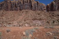 a dirt road through a desert plain with a mountain behind it and a clear blue sky in the background