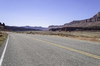 Endless road stretching through the desert landscape of Utah. Surrounded by majestic mountains and red rock formations, this scenic route takes you through the stunning beauty of Canyonlands and Lake Powell.