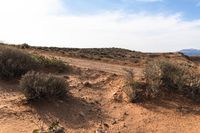 Utah's rugged terrain in the USA showcases a desert landscape with brown brush and shrubs. Blue skies contrast with distant mountains. Off-road track reveals the beauty of Canyonlands.