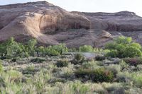 This stock photo showcases the stunning desert landscape of Utah, USA. The red rock mountains and open spaces create a picturesque scene. The trees in front of the mountain are green, and the vegetation is very low on one side. The rugged terrain and rocky outcrops add to the wild and natural beauty of this off-road track. With clear blue skies and fluffy white clouds, this image captures the essence of the North Wash area in Utah's Canyonlands. The geology and formation of the bedrock make this location a must-visit for nature enthusiasts and adventurers alike.