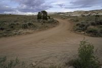 This image features a deserted dirt road leading through the landscape of San Rafael Swell in Utah, USA. The road surface is made of sand, and the surrounding vegetation consists of brown grass and red rock formations. The grey sky in the background indicates an approaching storm, adding to the sense of gloom and desolation. The photo captures the natural beauty of the desert and showcases the rugged terrain of the area. The empty road invites exploration and adventure amidst the stunning canyonlands.