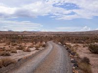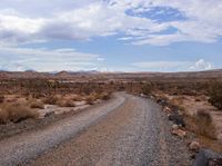 This stock photo features a gravel road passing through the beautiful desert mountains in California. The road surface is rugged and covered in gravel, with no cars in sight. The landscape is plain and rural, with scattered vegetation and plant communities. The sky is grey and gloomy, with clouds covering the surface. The image captures the natural beauty of the desert terrain and the straight road leading into the distance.