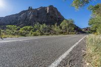 A road winds through the low desert landscape, surrounded by mountains and rocks. The sun shines brightly in the clear sky, casting a warm glow on the asphalt. A perfect day for a drive.