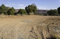 a dirt road with sparse brush on both sides and mountains behind it in the background