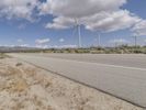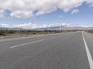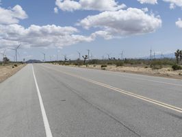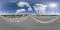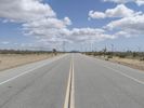 A straight road stretches through a desert landscape, lined with multiple white lines in the middle. The clear day showcases the vast horizon and the surrounding rural fields. The road surface is smooth asphalt, leading to a dome-shaped structure on the map.