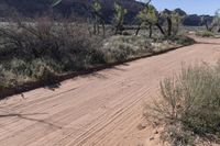 an empty road with dirt and weeds along it in desert area with sun shining on it