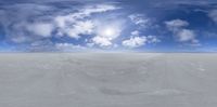 An endless salt flat stretches under the sun, creating a serene and surreal environment. Clouds form a skydome above, enhancing the desert landscape's open space and sunny ambiance.