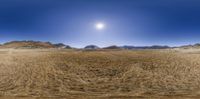 A wide view of the desert in Shangri-La, Yunnan, China. The dirt and snow-covered landscape at twilight or dawn creates a serene atmosphere. The sun rising adds a touch of warmth to the cold surroundings.
