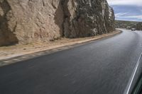 This is an image of a road in a desert landscape in South Africa. The asphalt road winds through the terrain, surrounded by bedrock and vegetation. The clear sky overhead contrasts with the clouds on the horizon. The motion blur suggests the presence of an automobile traveling on the road. The image captures the natural beauty of South Africa's landscape and the vastness of the desert. It represents a typical day in Africa, where nature and the open road meet.