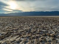 A beautiful sunrise over an open desert landscape. Sun visible above the horizon, casting a warm glow on the sandy dunes. Off-road track traverses the sandy surface. Perfect sunny day for an adventure.