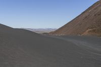 a motorcycle is parked in the middle of a barren desert valley in the foreground is a mountain range