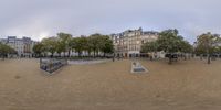 A serene view of a deserted beach in Paris, France. Classic architecture and historic buildings line the city streets. Benches scattered around create a peaceful open space. The perfect spot for a relaxing vacation.