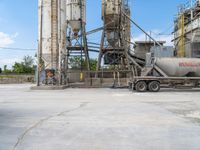 large cement plant in a deserted industrial space and equipment to make it work on the road
