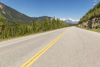 This stock photo features a deserted mountain highway in Canada. The asphalt road is surrounded by a stunning landscape of mountains, forests, and trees. The lone mountain range in the background adds to the natural beauty of this highland scene. The image was taken during a sunny day, with clear skies giving a beautiful contrast to the road surface and vegetation. The slope of the mountains and the presence of clouds in the sky further enhance the overall scenic view. This captivating image captures the essence of British Columbia and Alberta, two provinces in Canada renowned for their breathtaking natural landscapes.