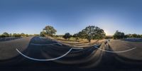 A deserted road in California, surrounded by trees and open space. The low sunlight creates long shadows, adding to the peaceful and serene landscape. A perfect destination for outdoor activities in the wilderness.