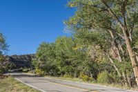 A lone motorcycle is seen traveling through a rugged landscape on a deserted road with a long yellow strip. The clear sky above contrasts with the lush vegetation and woody plants along the path. A perfect day for a recreational ride in nature.
