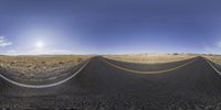 a wide angle view of a deserted road in the desert, showing the lines of road on both sides