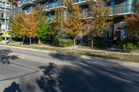 This stock photo depicts a modern urban landscape in Toronto, Canada. Along the side of a street, trees line the asphalt road as buildings and storefronts create a bustling atmosphere. A man on a bike adds movement to the scene. The hard shadows emphasize the dynamic architecture and design of the city. This image captures the busy, urban energy of Toronto with its modern buildings and vibrant shopping areas.