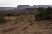 This stock photo depicts a desolate landscape with vegetated areas and prominent bedrock formations. The terrain consists of hills and mountains, with a road cutting through the scene. The grass surface is sparse and mixed with desert vegetation. The terrain is mostly composed of dirt and gravel, giving it a rugged appearance. The day is gloomy, with a grey sky and clouds covering the mountain peaks. The image captures the desolation and remoteness of this isolated location.