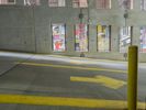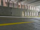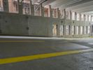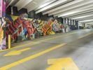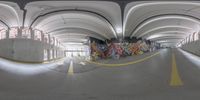 an empty road with lots of graffiti on it in a building's ceiling covered with arches