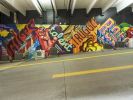 A graffiti-covered road in Detroit's art district. The empty road leads to a building with a ceiling covered in arches, creating a unique architectural facade. The vibrant yellow graffiti adds a pop of color to the urban landscape.