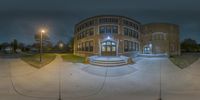 A dramatic night scene in Detroit's business district. The classic architecture of a building is illuminated by street lights, casting eerie shadows. The symmetrical facade creates a sense of drama and intrigue.