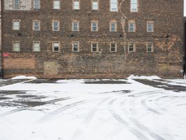 Snow-covered streets of Detroit's art district. Buildings with brick facades line the road, reflecting the winter sky. Cars parked in the freezing weather create an urban packshot of the city.